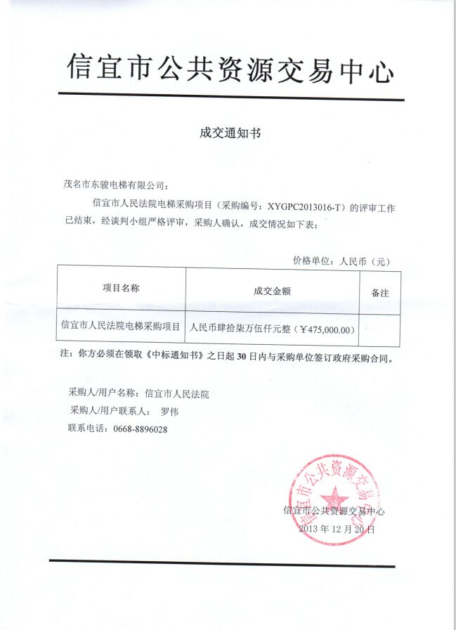 | 祝賀茂名市東駿電梯有限公司中標(biāo)信宜市人民法院電梯設(shè)備采購(gòu)招標(biāo)項(xiàng)目 |