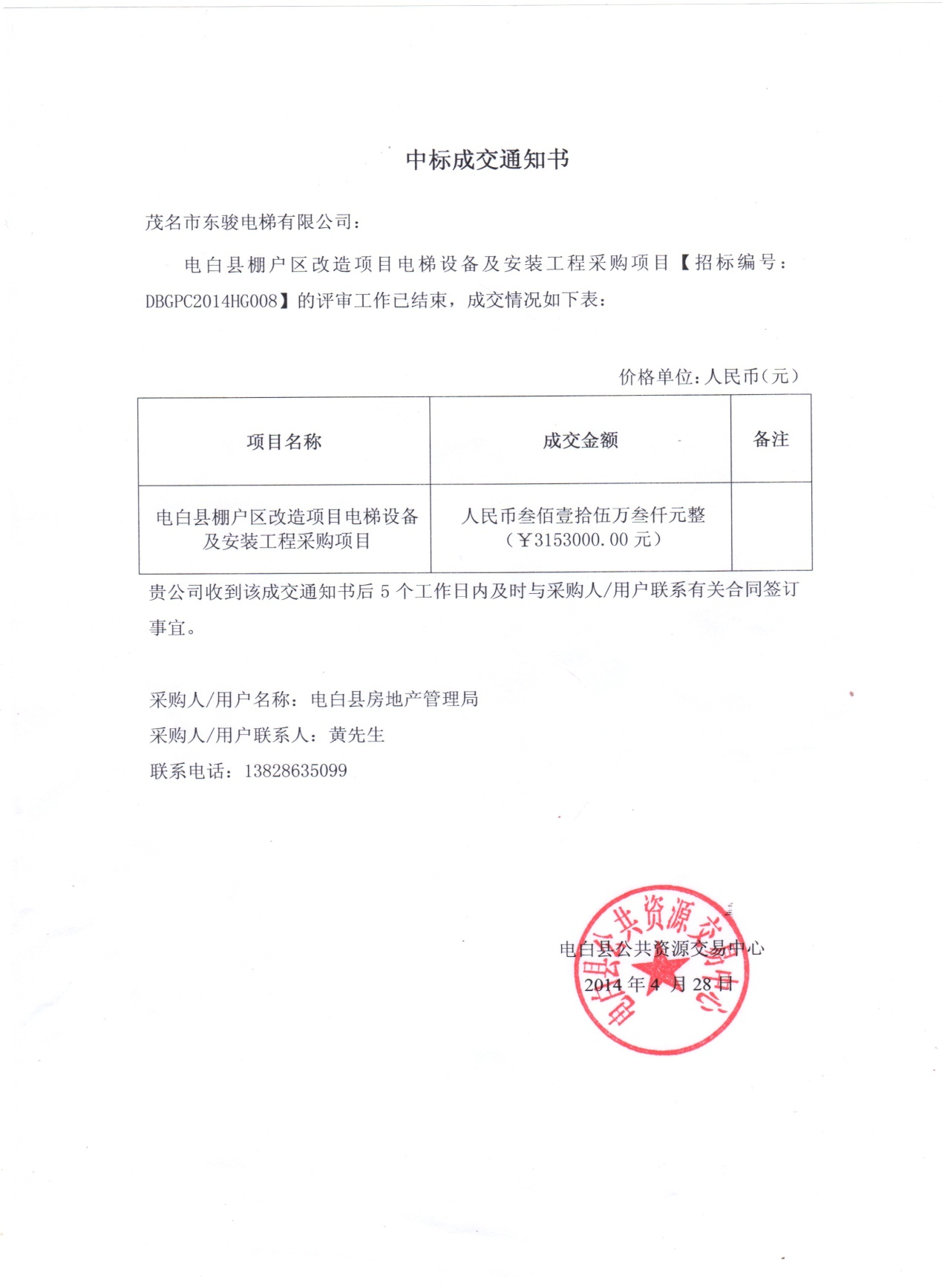 | 祝賀茂名市東駿電梯有限公司中標(biāo)電白縣房地產(chǎn)管理局電梯設(shè)備采購(gòu)招標(biāo)項(xiàng)目 |