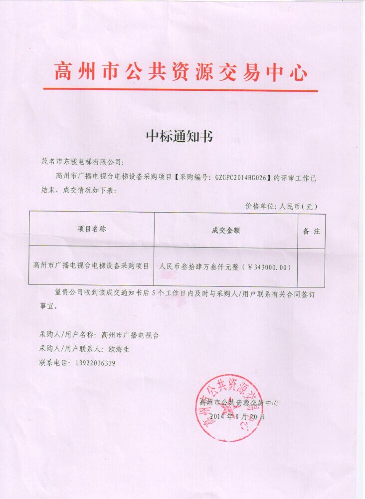 | 祝賀茂名市東駿電梯有限公司中標(biāo)高州市廣播電視臺(tái)電梯設(shè)備采購(gòu)招標(biāo)項(xiàng)目 |